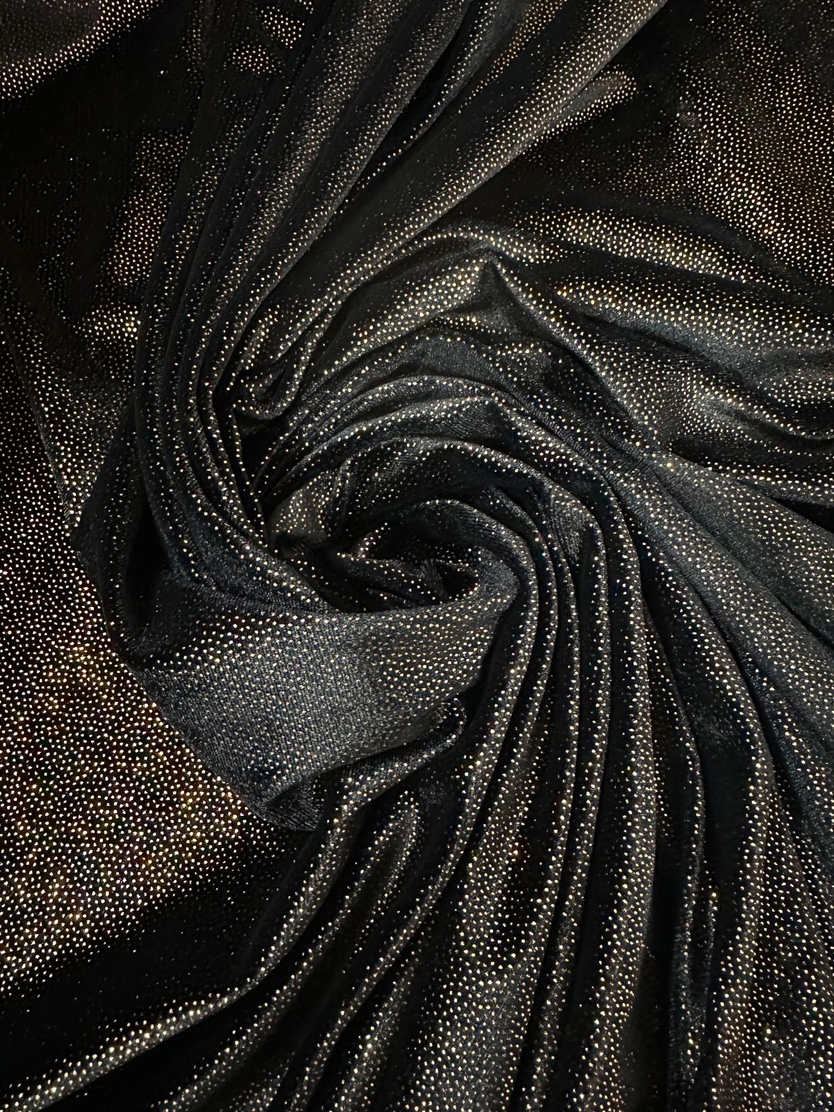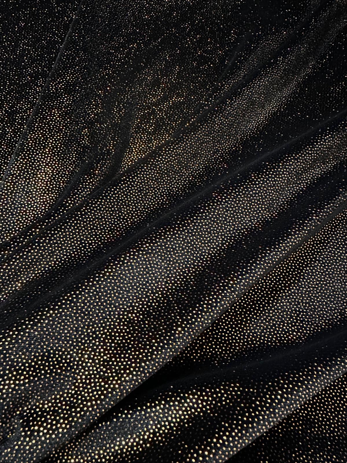Este terciopelo se usa mucho para prendas de fiesta, ya que lleva el detalle de las pintitas en dorado.