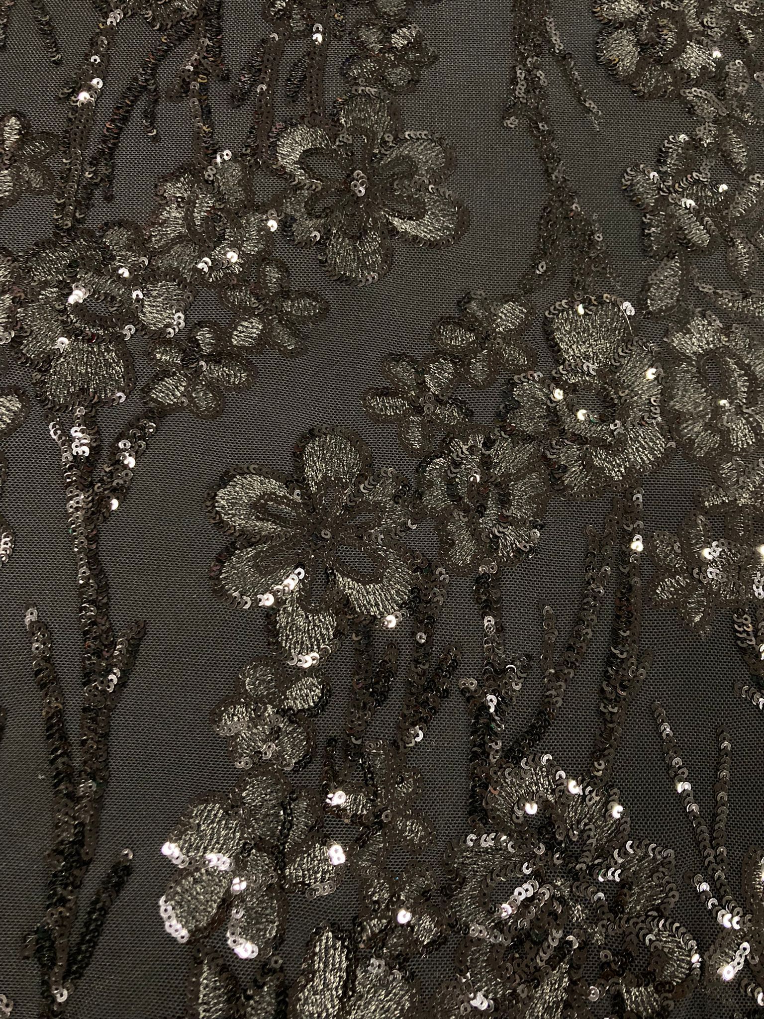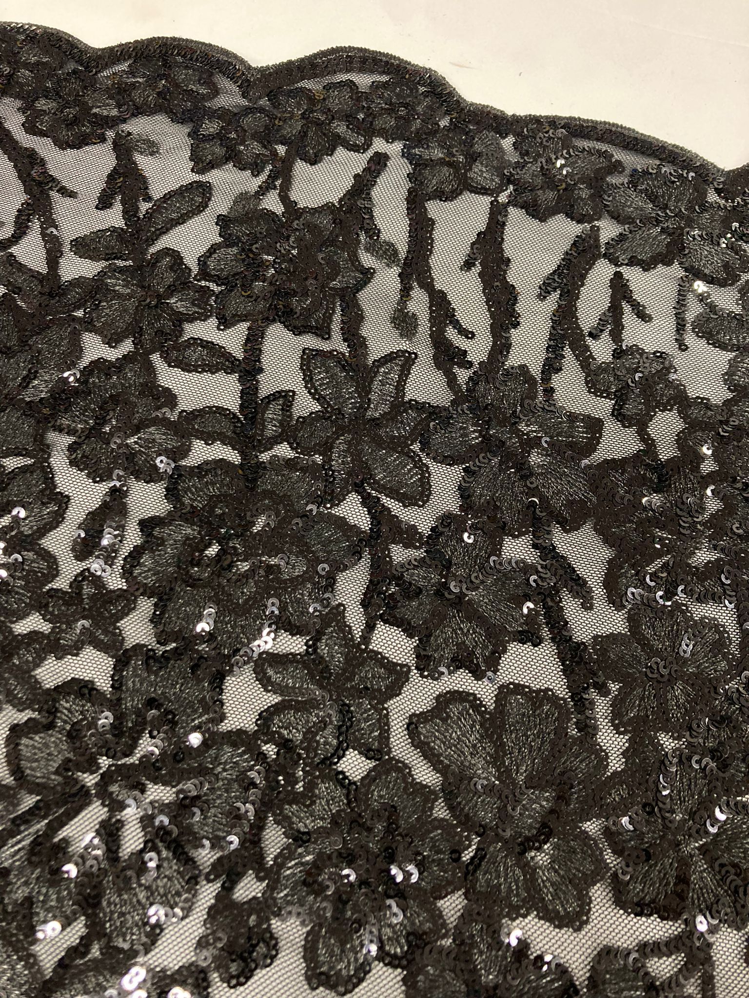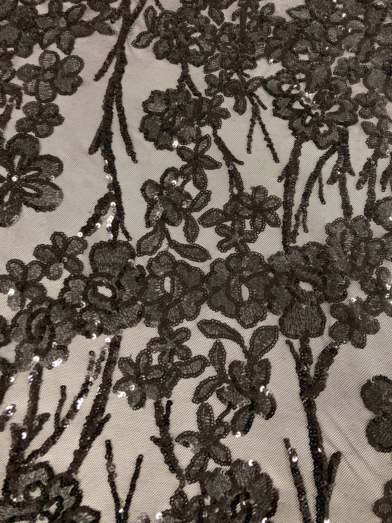 Se trata de un precioso y delicado tul negro bordado con flores y ramas, además del bordado lleva lentejuelas.