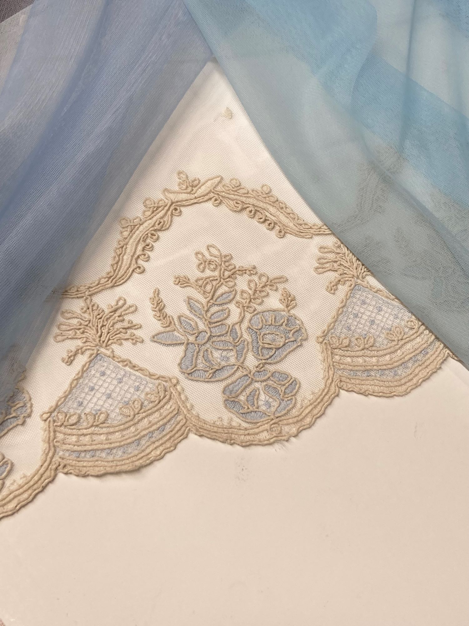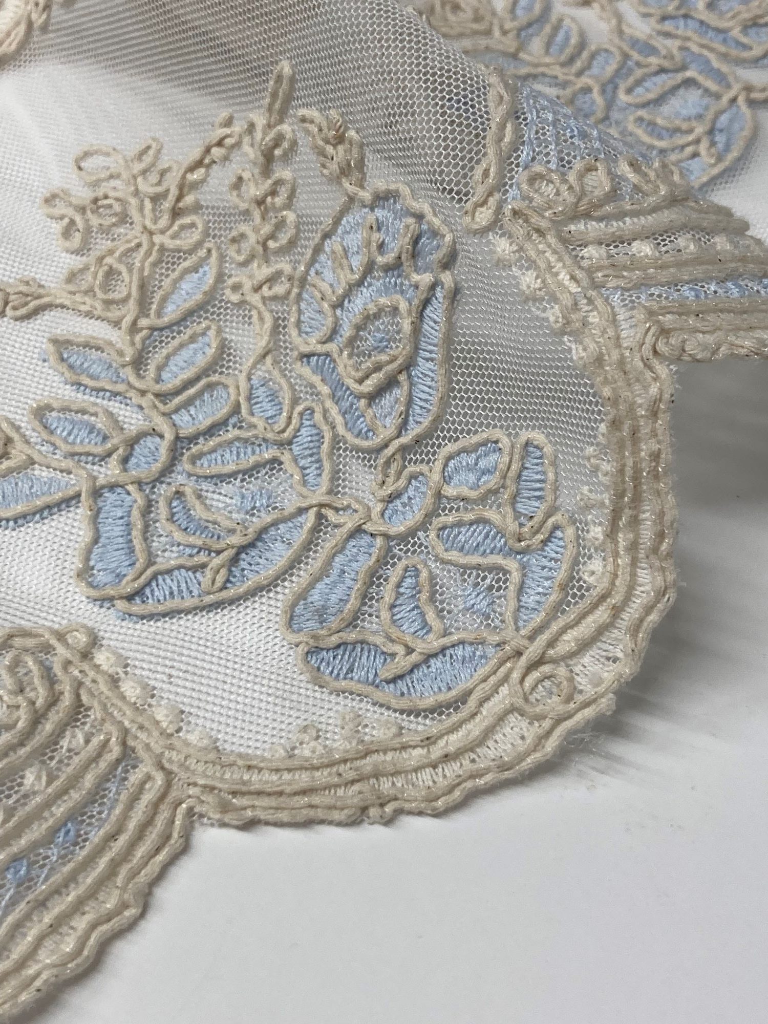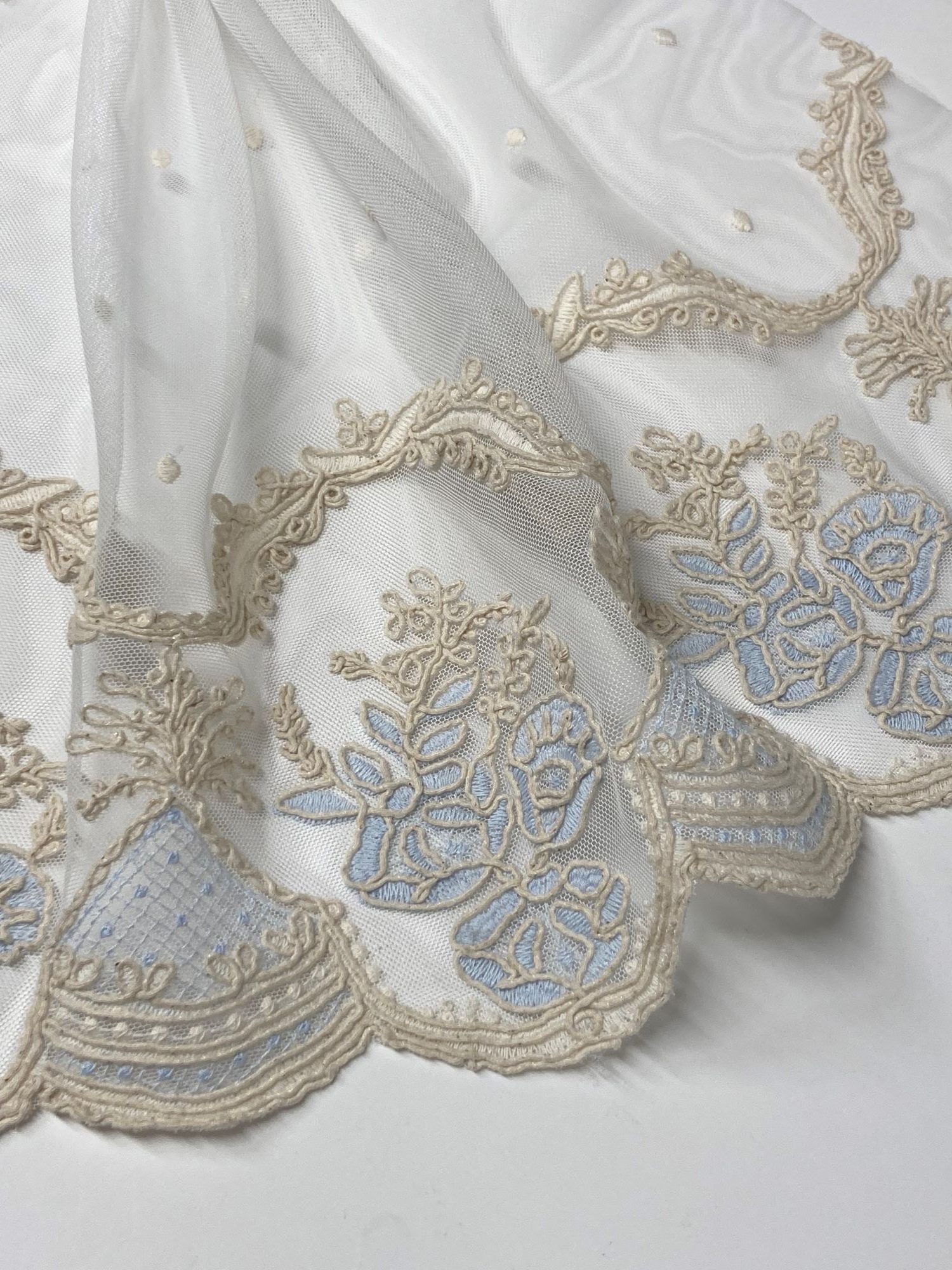 Tul bordado con estampado que presenta flores en tono beig y celeste, además tiene topitos bordados en beig por toda la tela.