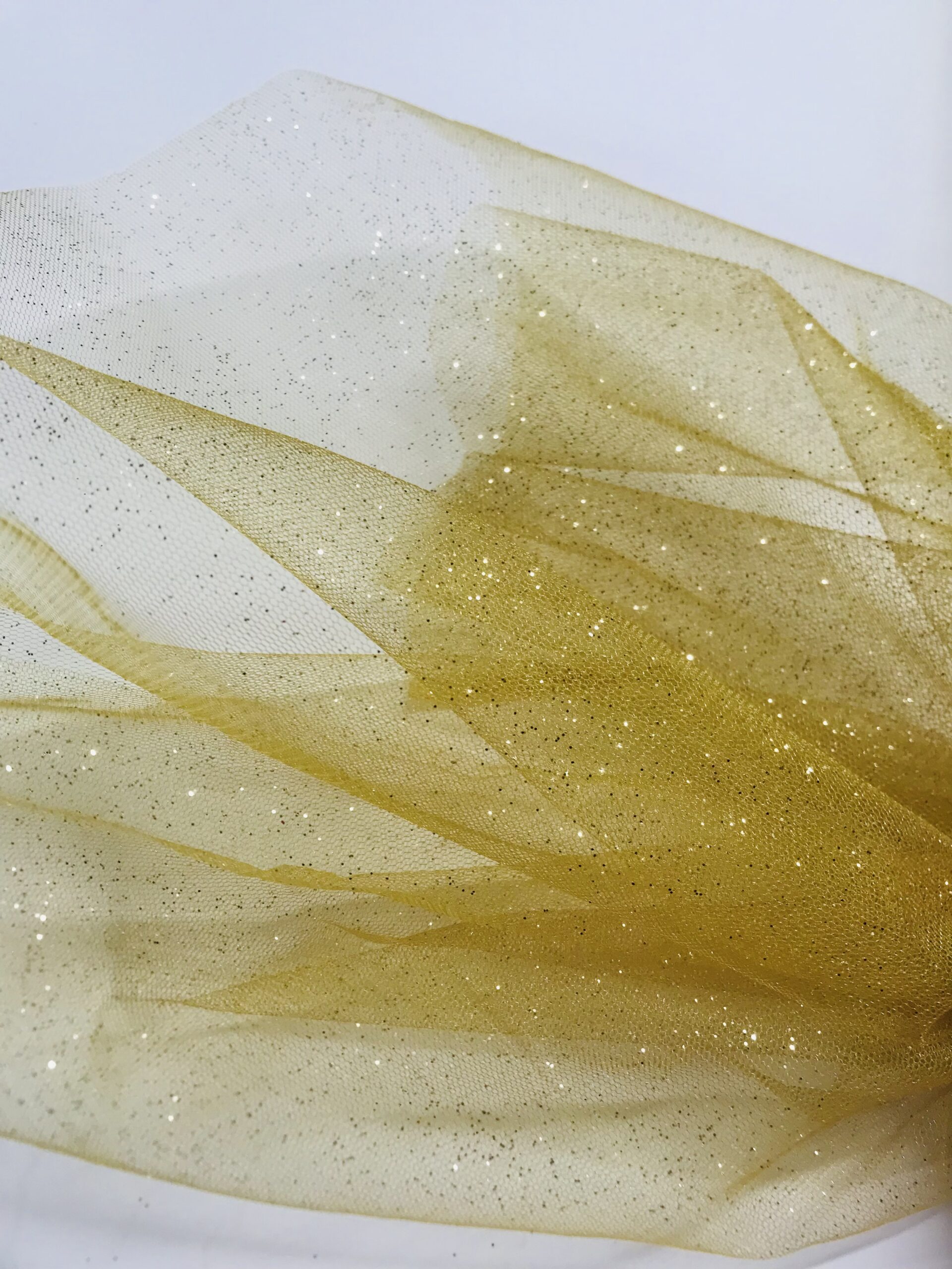 Tela de tul especial para decoraciones y disfraces, es de color dorado con purpurina dorada