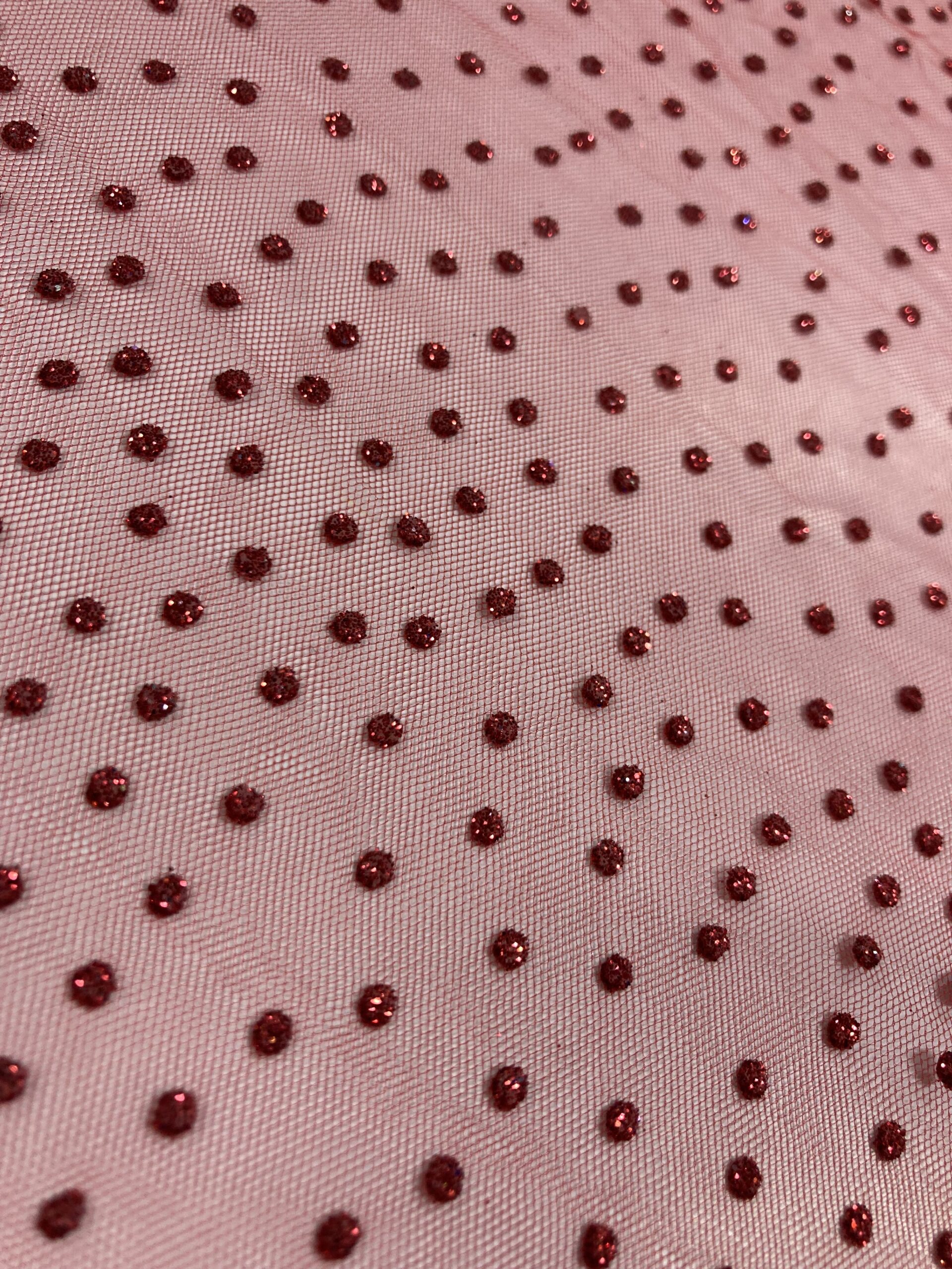 El tul de plumeti o plumeti de tul es un tejido con una base de tul de rejilla fina con topitos. En este caso el topito va flocado con purpurina color rojo y el tul también es rojo.