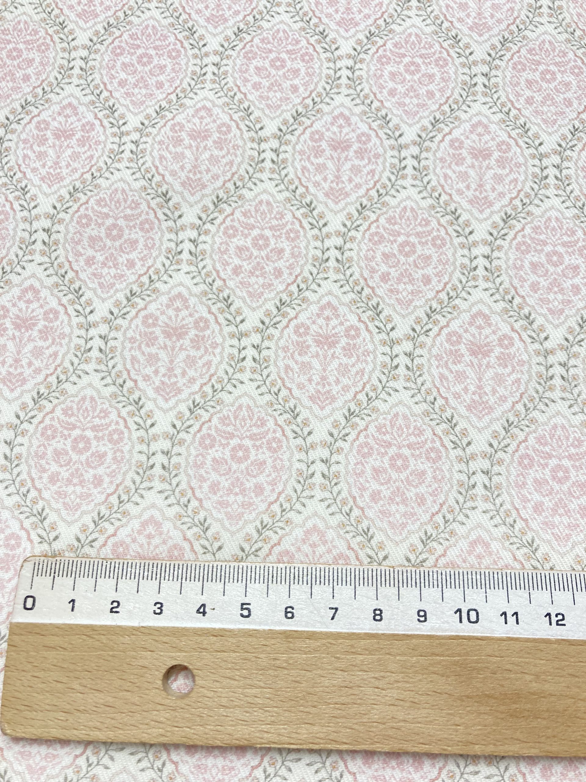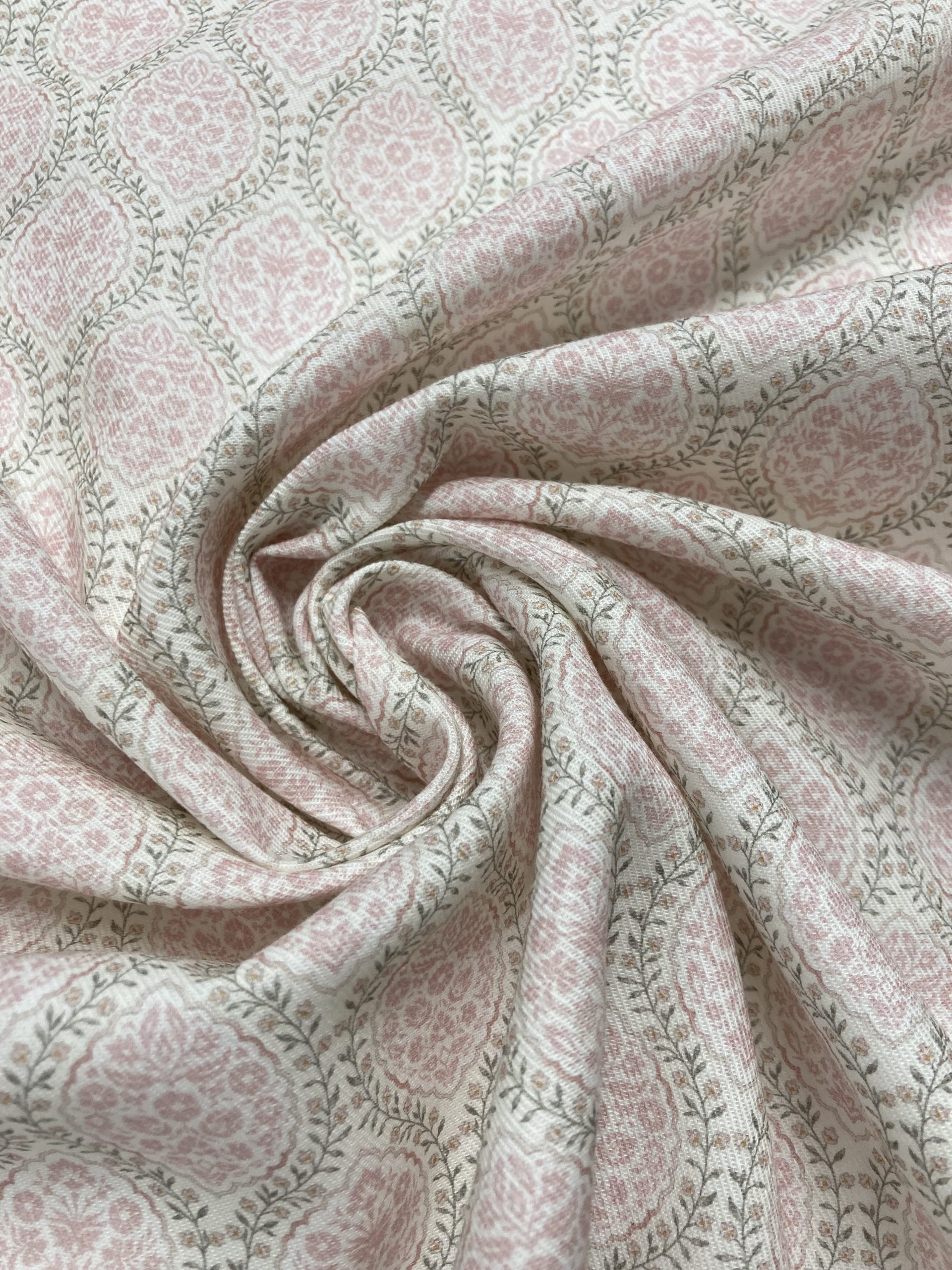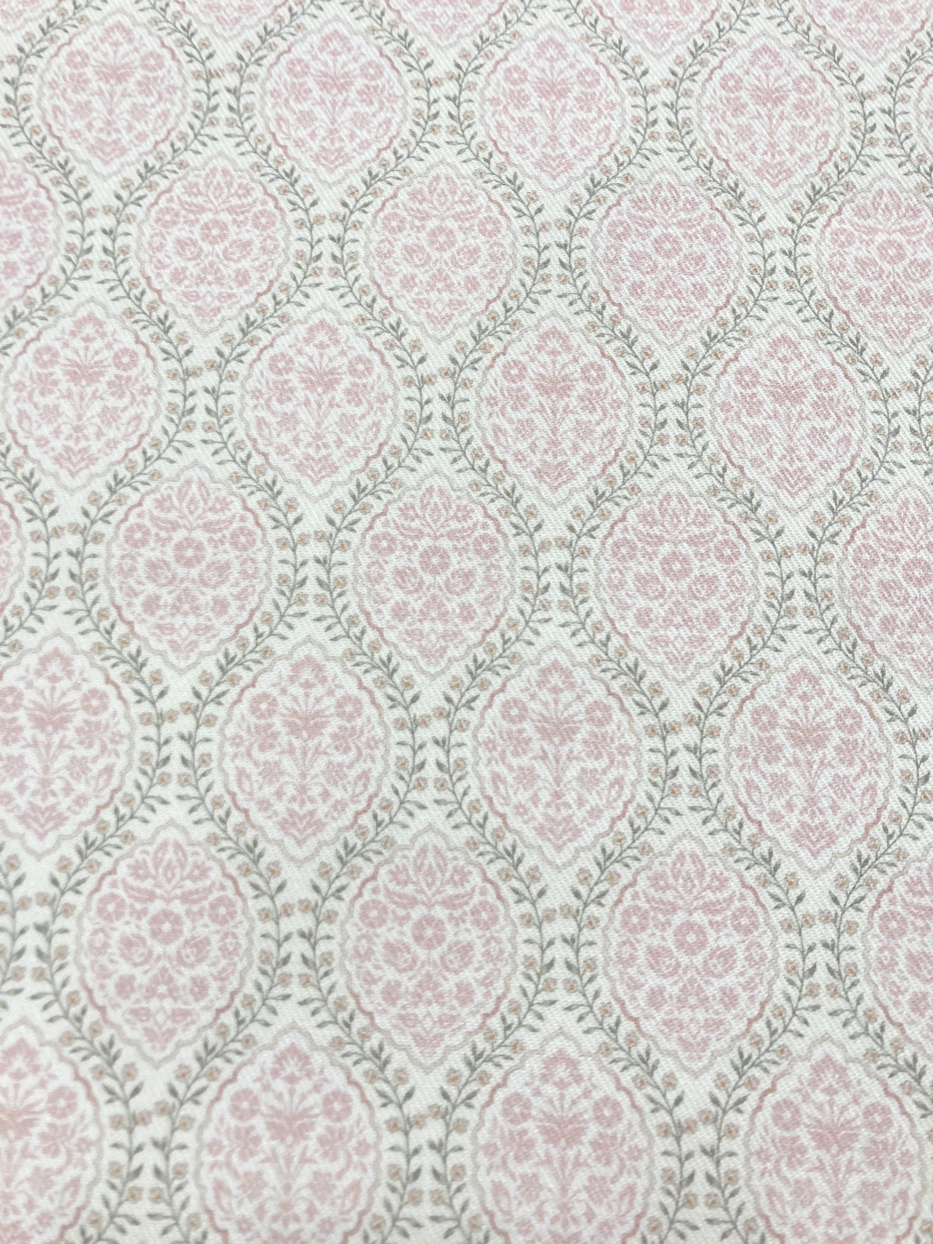 Esta villela Atari Mosaico, estampado de mosaico en tono gris, rosita, verdecillo, azulito sobre fondo beige.