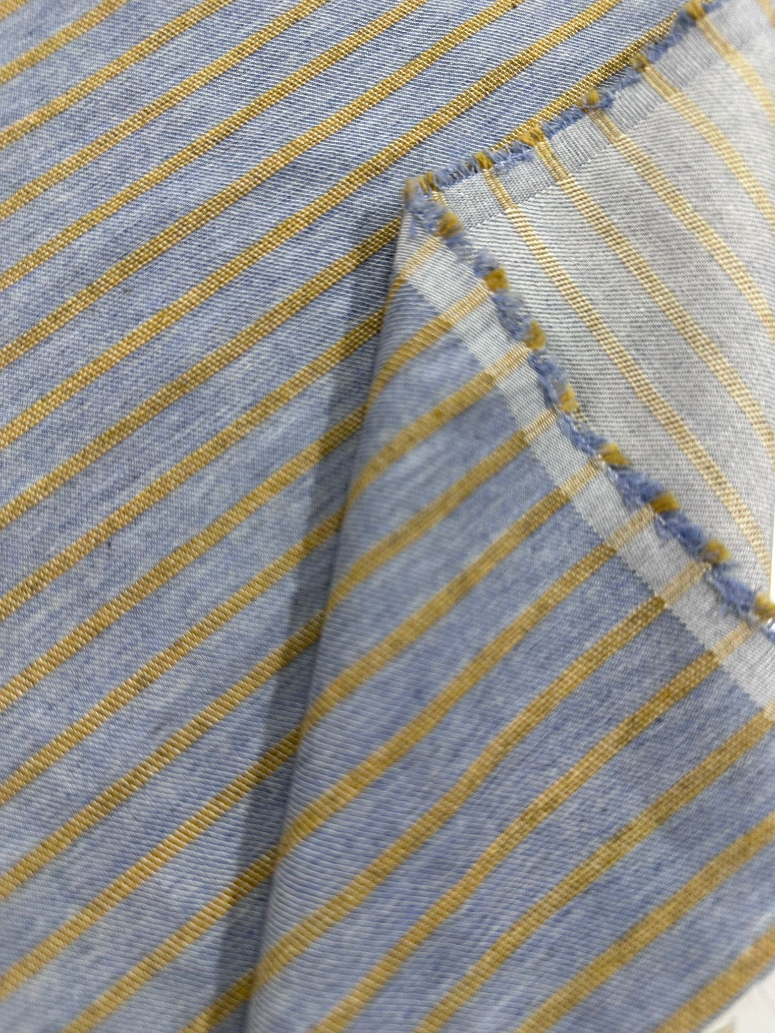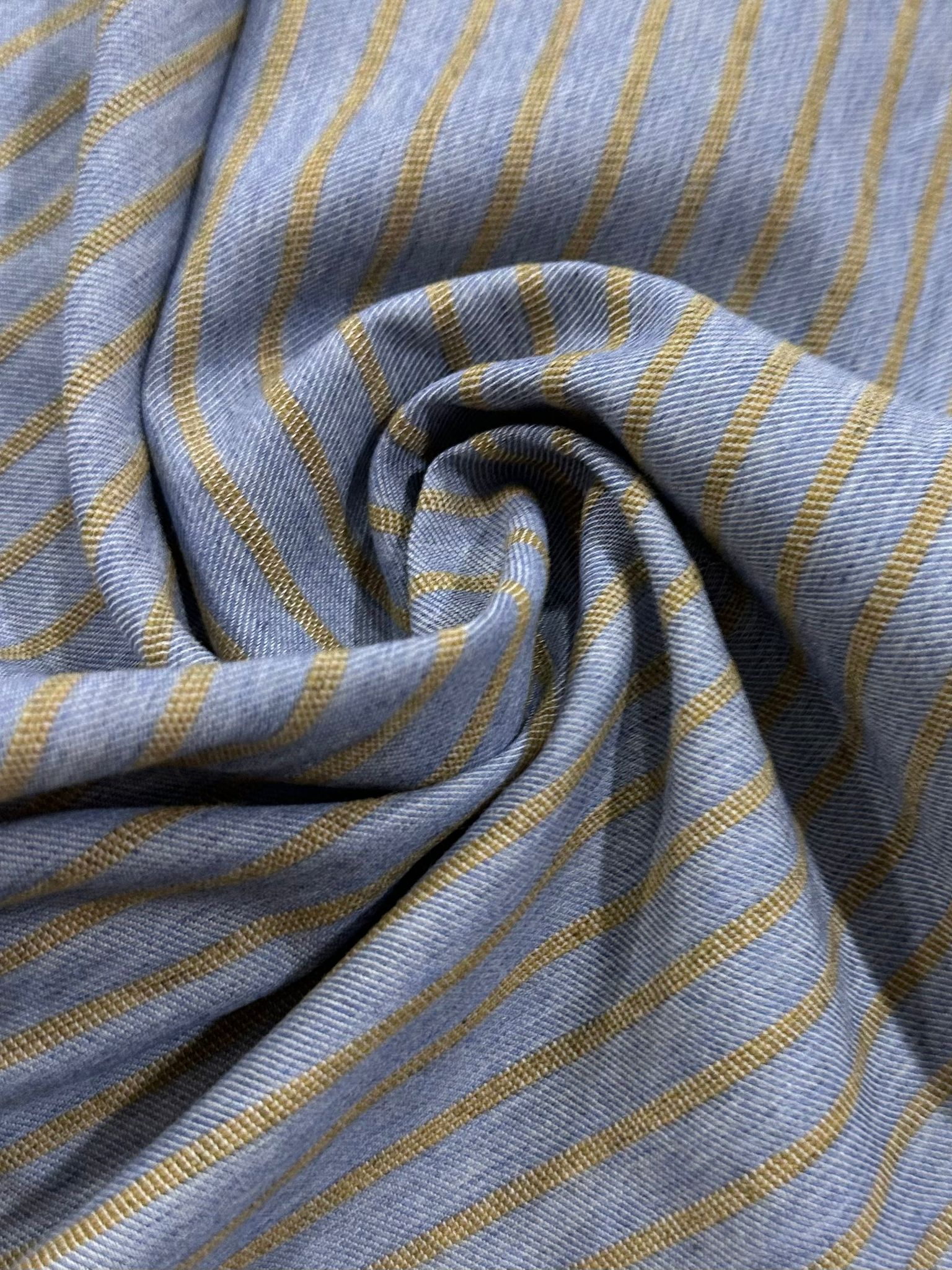 El Fondo de la tela es azul grisáceo , el color no se ve liso completamente sino que va haciendo una mezcla tipo Denim o vaquero, la raya va tejida en color mostaza.