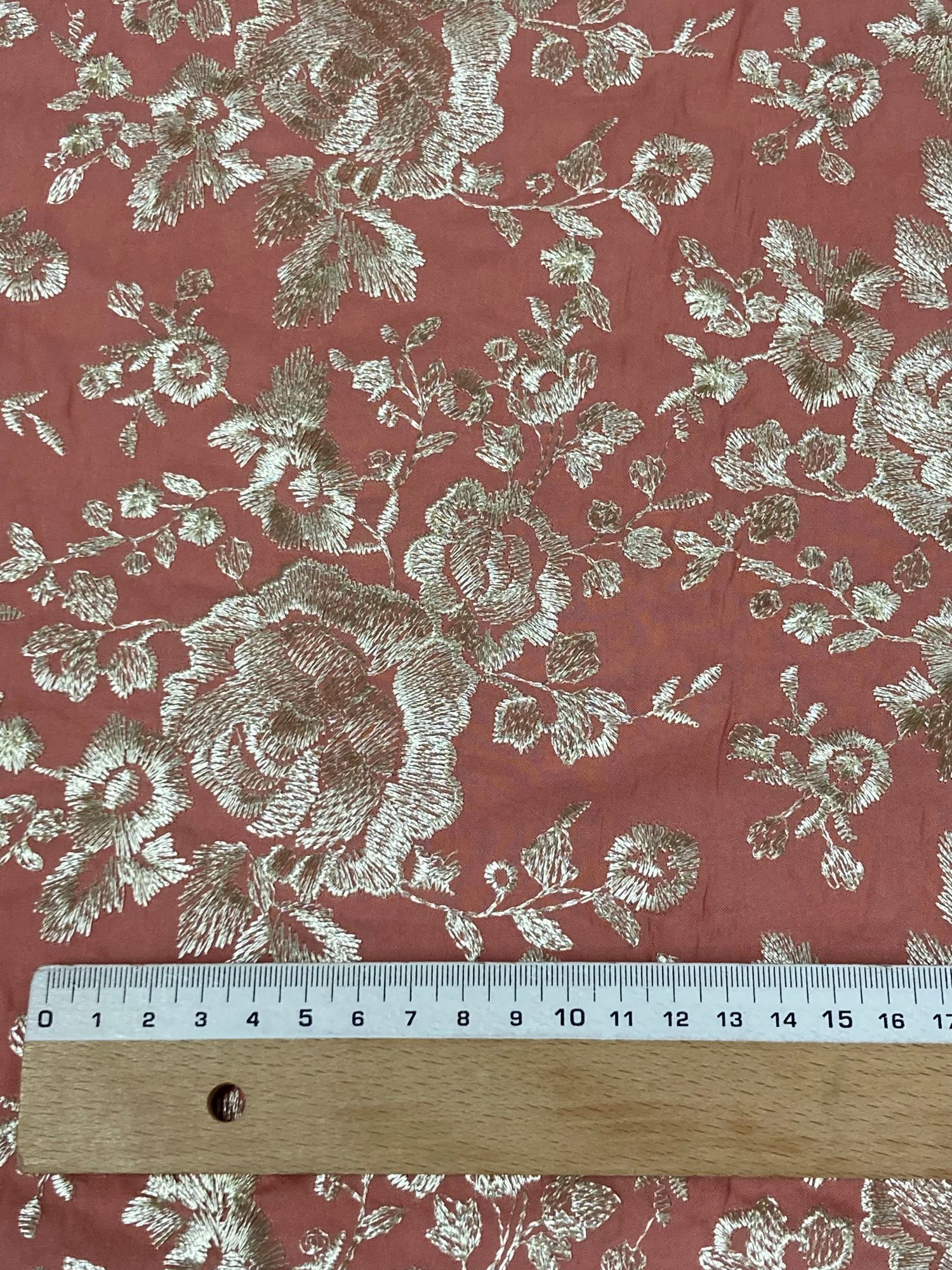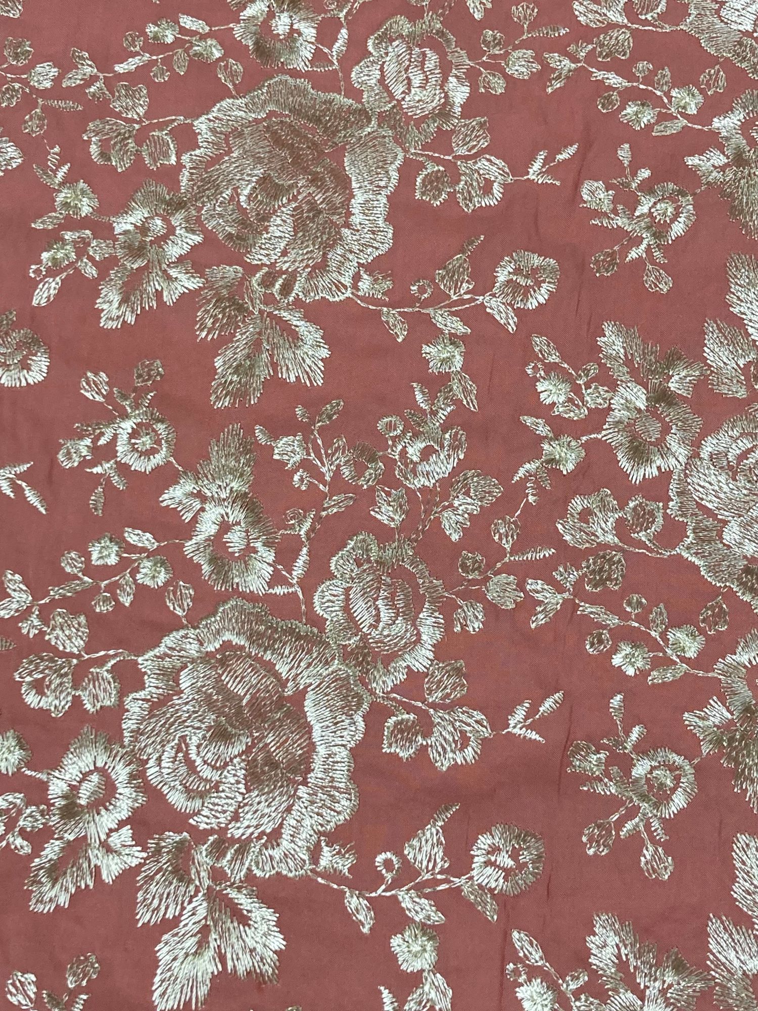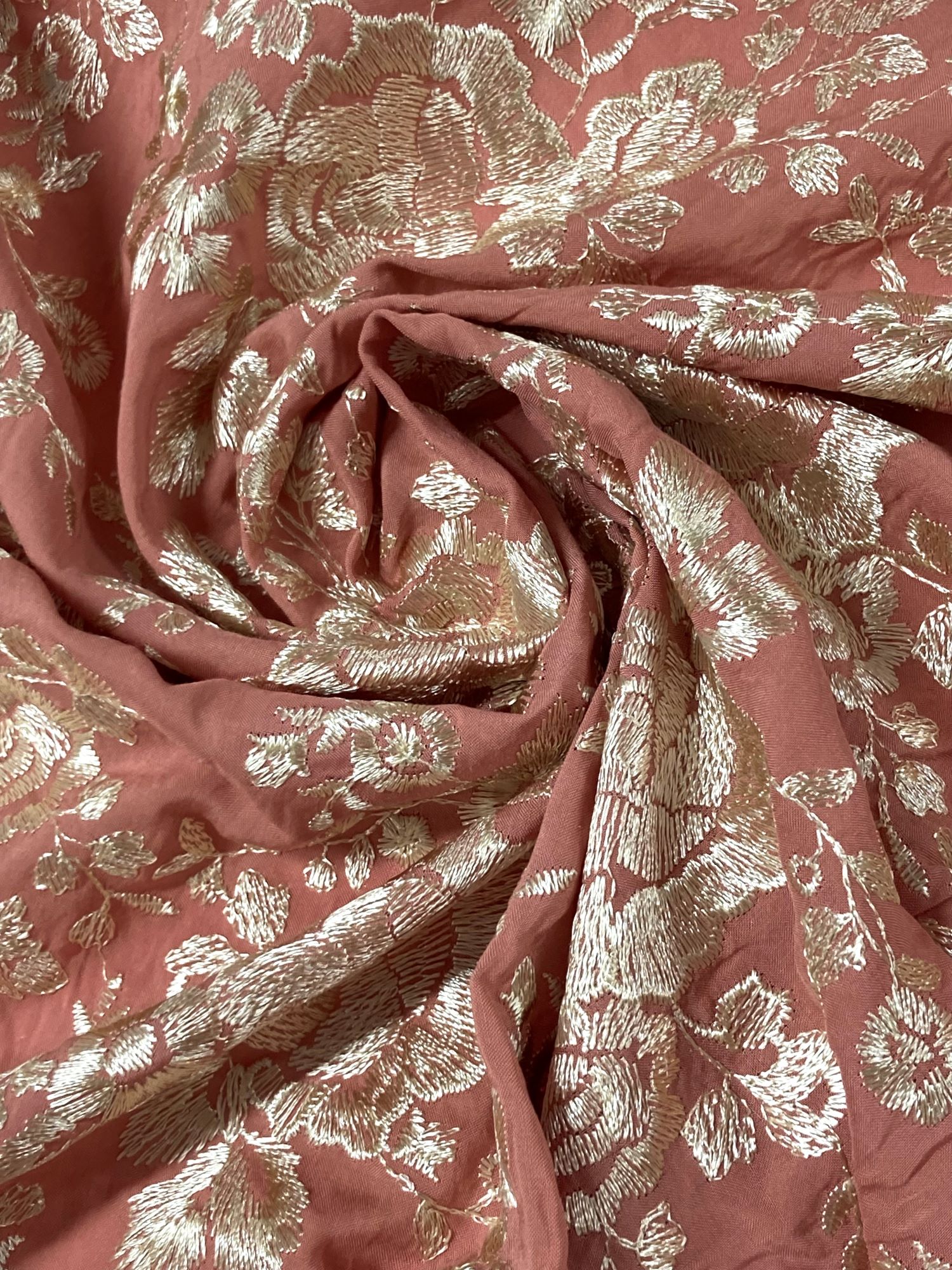 Es una tela con base de viscosa en color salmón oscuro y bordado de flores en color dorado clarito.