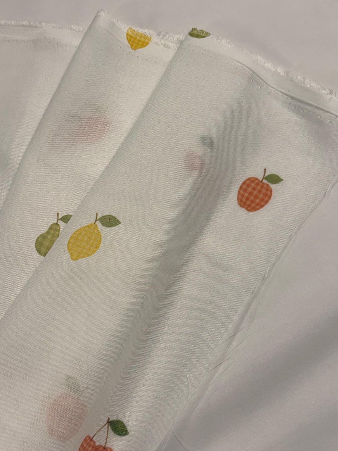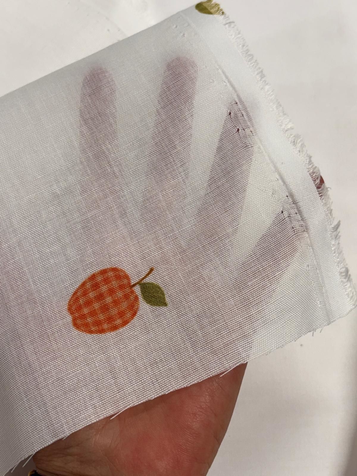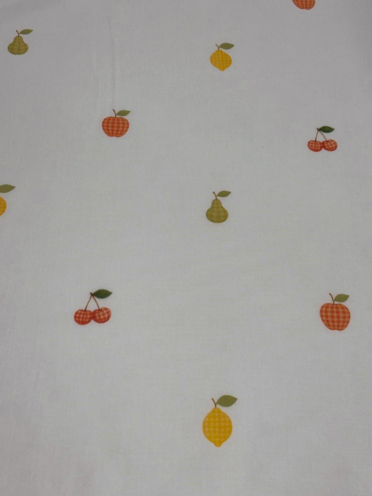 Visillo etamín Frutas cuadros es un visillo en color blanco con frutas de colores en tonos naranja, verde y amarillo.